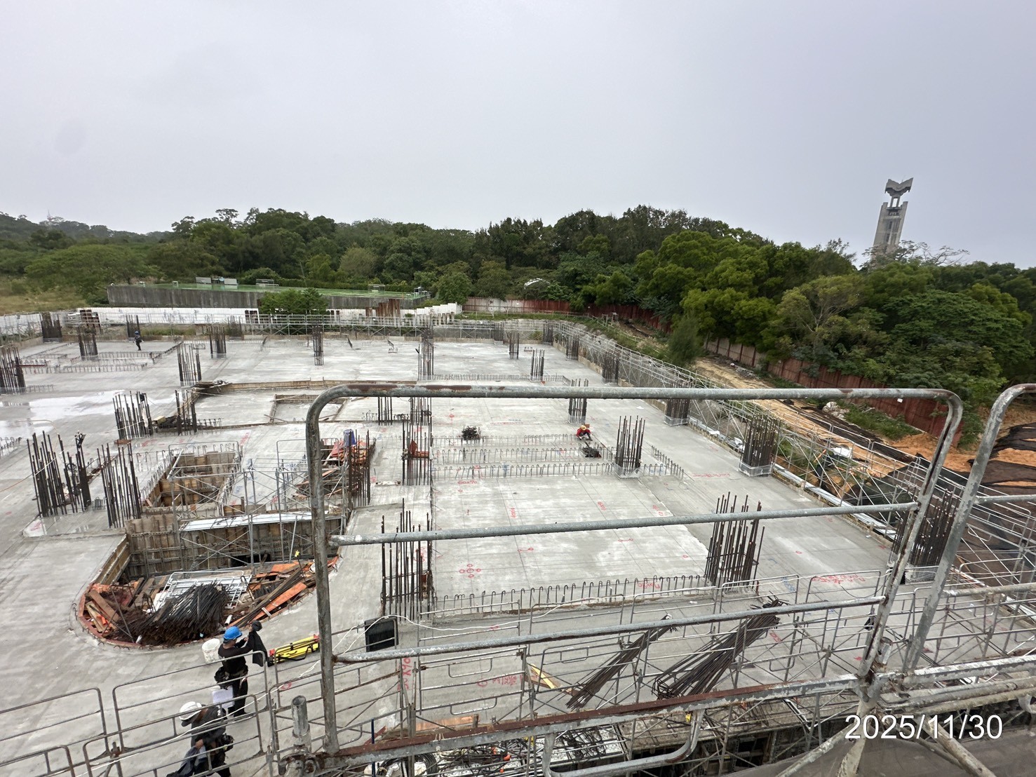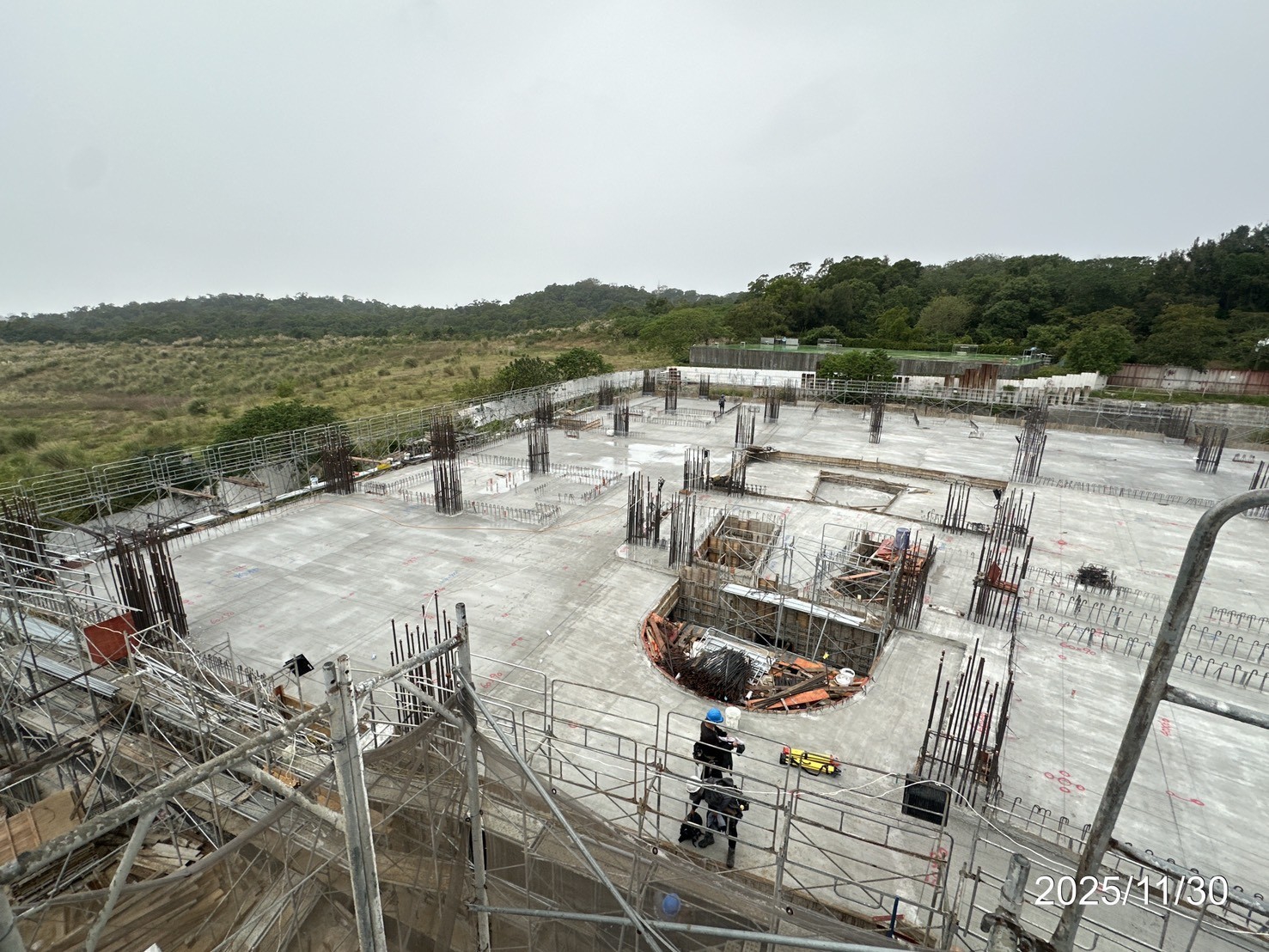 主工程進度:於111年2月14日開工,歷經停工於114年4月15日復工,預定進度:15.16%、實際進度:18.93%(114.12.2止),114年10月9日完成B1地坪混凝土澆置,114年11月11日完成B1F自來水下水箱混凝土澆置,114年11月29日完成B1層混凝土澆置。目前進行澆置後混凝土養護及1F地坪結構放樣。