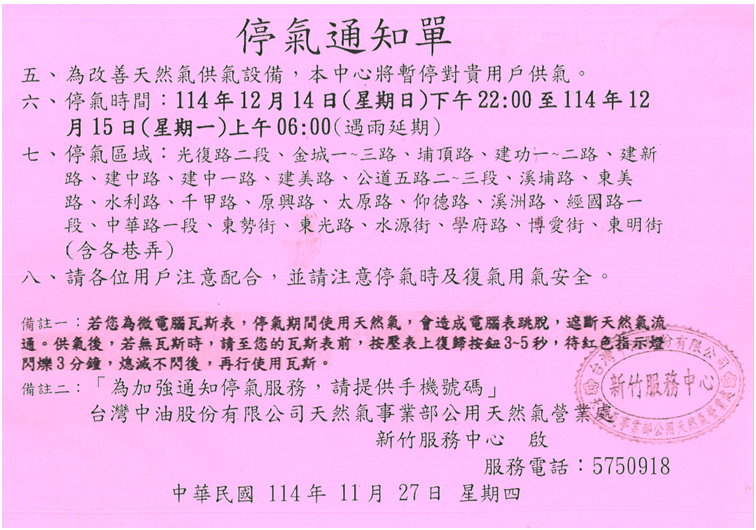 主 旨:依台灣中油公司公用天然氣營業處停氣通知辦理公告。