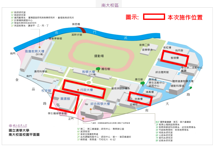 二、施工位置:南大校區(樹德樓、崇德樓、圖書館、行政大樓)。施工期間將進行纜線更換、測試及調整作業。