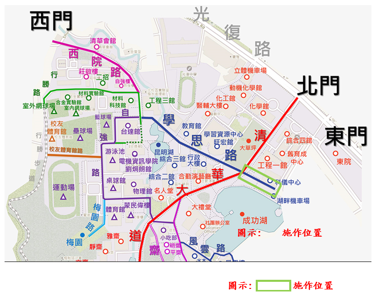 三、施工期間為配合施工作業施工範圍內路燈將暫時關閉,敬請用路人注意安全;非相關人員請勿靠近施工周邊區域,人車請依管制通行,作業期間須佔用部分車道造成不便,敬請見諒,施工期間如遇校方重大活動或不可抗拒因素,將配合順延施工。