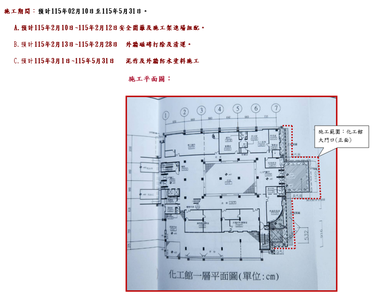 2/10~5/31 化工館大樓外牆整修工程(正面)施工公告