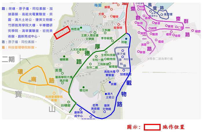 二、施工位置:游泳館前、行政大樓、教育館前至相思湖前等(詳附件施作位置)。
